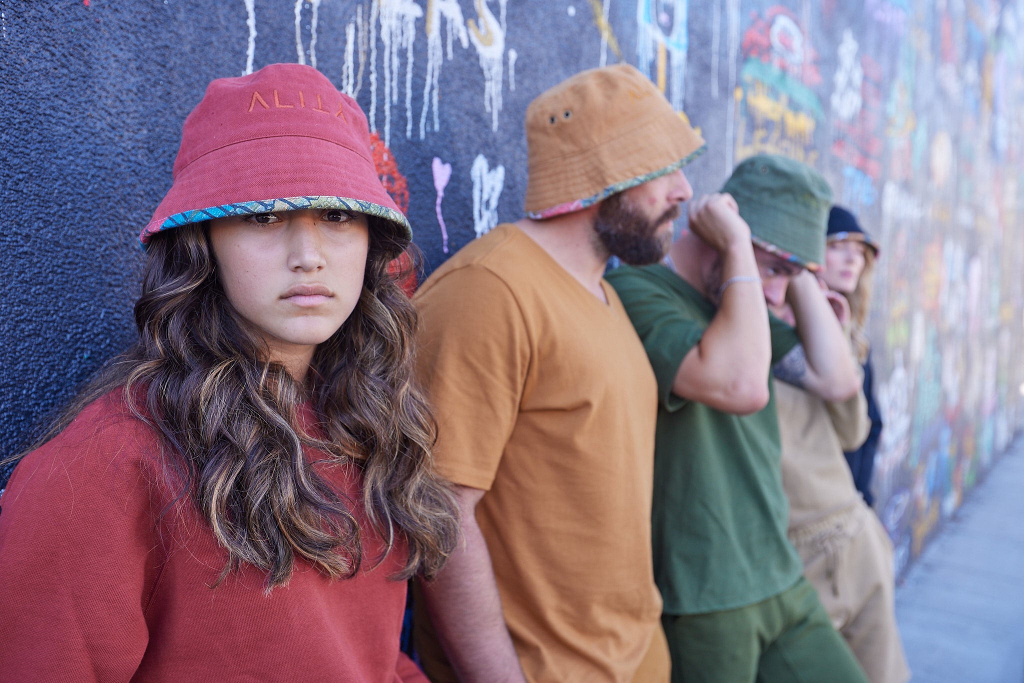 This reversible bucket hat comes in all our signature colors, each with this unique LAYERS painting printed on the reverse side. What's inside, what's outside — that's your call. Either way you flip the drip trip, a slice of Autumn's work is visible. Featuring the embroidered color-on-color ALITY logo on the solid side and binding detail along the bucket rim.
